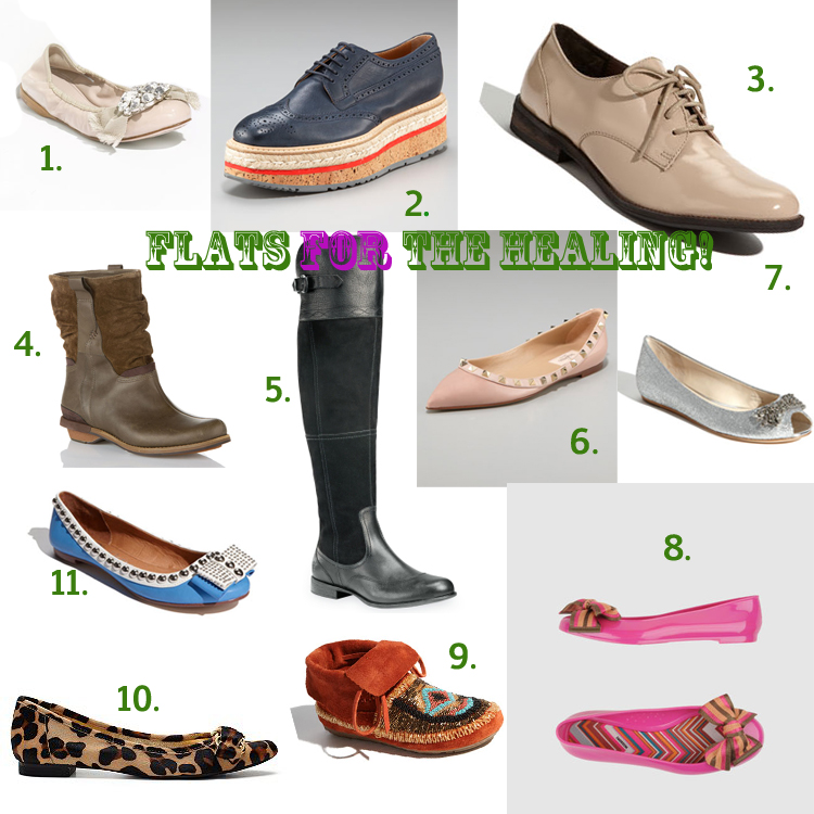 Yes, I’m on crutches. So while my Dr. sis has put me on foot rest and instructed me to stay off any kind of sexy stiletto, I’ve been pretending to want to own some flats. I did some virtual shopping and found some really cute options! I’d actually wear all of these… now.