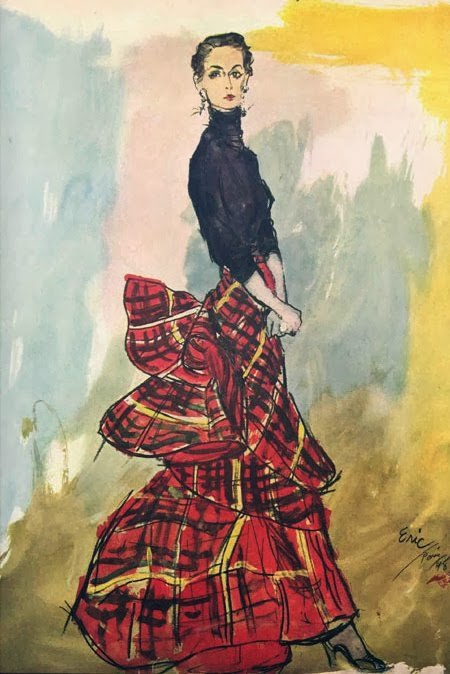 I’m particularly excited about the full length Tartan ruffled and gathered dress; a vintage sketch by Carl Erickson for Vogue, circa 1948. Very much a Carolina Herrera-esque (I’m digging for a familial relationship here!) appeal to it I think could walk the red carpet today.