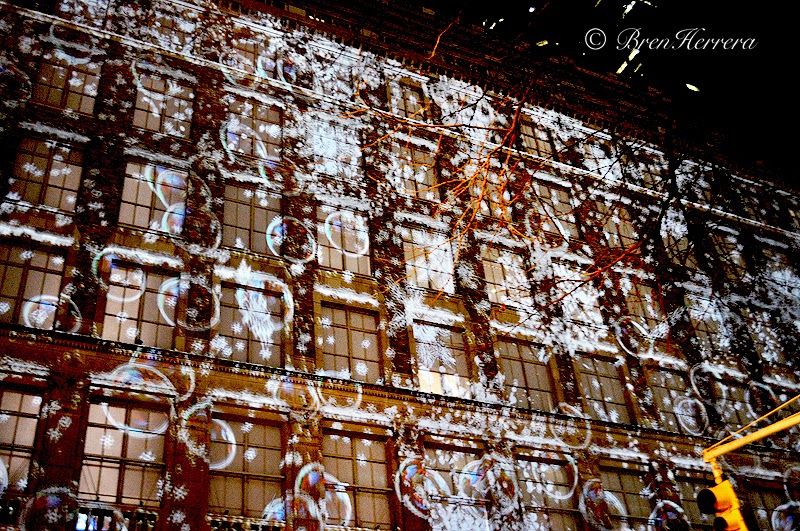 Yes, we were complete tourists–again– but the flashing lights and fighting for a posing spot was worth watching the annual snowflake light show Saks Fifth Avenue does. We anxiously waited 30 minutes. In the rain. For this: