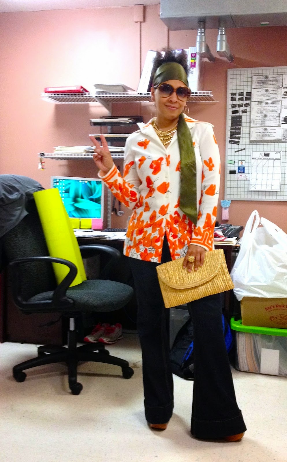 She walked into her building yesterday morning in full regalia, rocking the sunnies and shoes (2.5 sizes too big) and was completely unrecognizable. But, she won, hands down, channeling Thelma from ‘Good Times‘! Looking fabulous, really. I loved it for her.